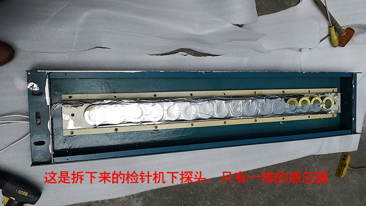 通過拆解后發(fā)現(xiàn)該檢針機確實是采用了單路單排的檢針機感應(yīng)器結(jié)構(gòu),這種做法是早期的一種做法,唯一的好處就是輸送帶很臟污都能使用。但是最大缺點就是一旦檢針機的周邊有磁場干擾,或者新機時還可以,用久點就抗干擾弱點嚴(yán)重暴露出來。